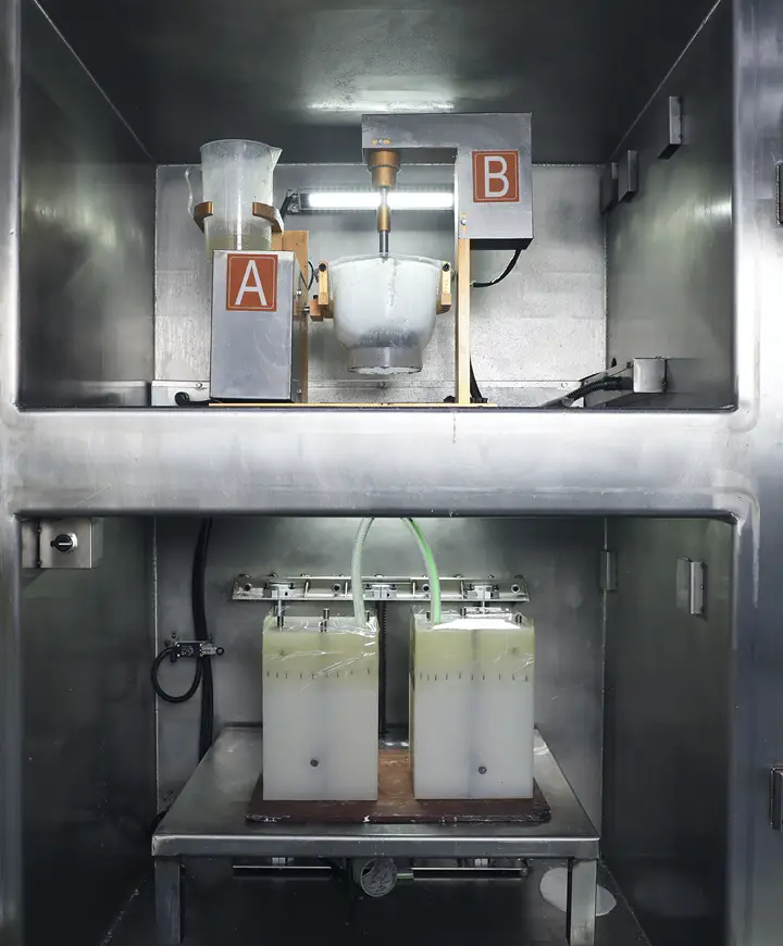 Mix liquid polyurethane resin and pour into molds under vacuum to prevent air bubbles and defects. Curing takes 30 minutes to 2 hours depending on material and size. One mold produces 1-10 copies daily. Cast urethane parts may require post-processing.
